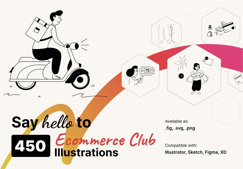 Perfect for eCommerce and payments - Ecommerce Club is the next chapter of the 450 Office Club illustration pack. Combine two packages and create the best products.